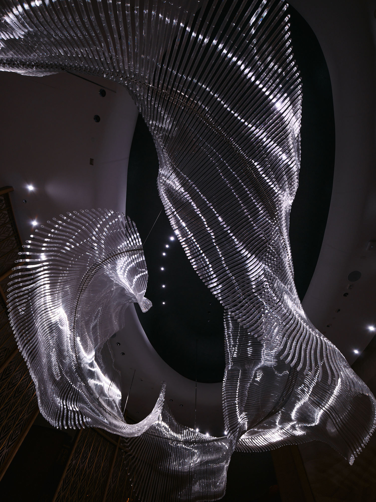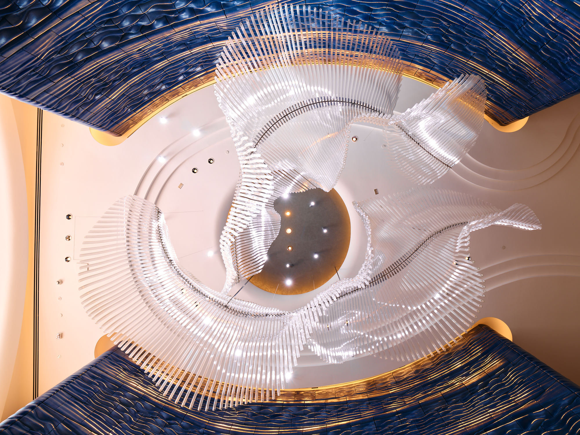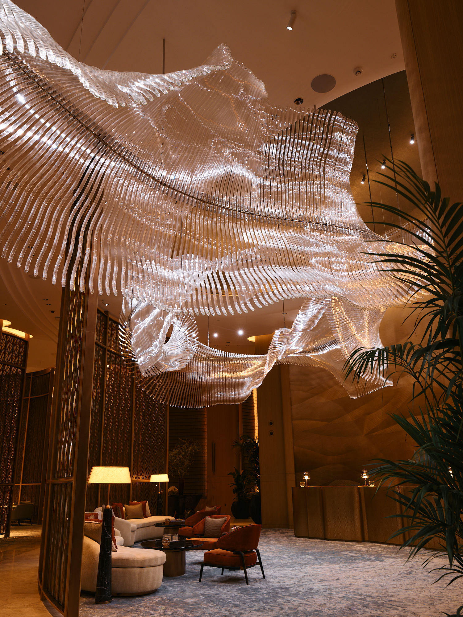 The SEA BREEZE lighting installation is inspired by the gentle winds and elegance of sailing. Designed to capture the sensation of a soft summer breeze flowing through a space, it creates an atmosphere of serenity, warmth and welcoming atmosphere.
